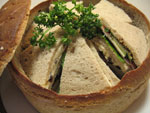 20cm丸型で焼いたライ麦パンをくりぬき、サンドイッチにして、再度つめます。 ふたを開けてビックリ!サプライズ!(笑)というパンなんだそうです。 サンドイッチの具が数種類あるのですが、これがなかなか、おいしかった。 いっこ分の小麦粉が、自宅でこねられる量じゃないので、 この形はうちでは作れそうにないのですが。。サンドイッチは、また作りたいな。 もうひとつのパンは、中の生地がブルーベリー色!ビックリ!ということで、(笑) これもまた、サプライズ・パンの一種なんだそうです。ははっ。 パン教室にて。。 さくら 3/26