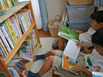 ちょっとせまいけど、読書コーナーができて、しかもクーラー直下で(笑)、 坊っちゃんたち、大喜び! 今まで、おもちゃに埋もれて隠れていた本も出てきて、さっそく読んでます。 本棚をきれいに片付けるため、大きい坊ちゃん、我が家の図書委員長に就任。(笑) あとは頼むよ〜。坊ちゃん。 翌日、腰高窓用に同じ柄のカーテンを買ってきて、付け替え完了。 部屋はさらに明るく、子ども部屋らしく生まれ変わりました。 黒くなるまで頑張ったカーテン…11年間、ありがとう。。