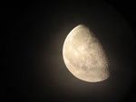借りためがねで、日食記念撮影。(笑) 若いお姉さんグループ3人に、このポーズで「写真を撮ってください!」と頼まれ、 なかなかよかったので、マネをさせてもらいました。ハハ。 第3回観望会-木星- 7/13 シナモンロールを焼いている横で、カブトムシのえさやりをしに出ていたオットー、 「今夜は木星がはっきり見える。」というので、急遽、11時過ぎから望遠鏡を担ぎ出し、 川べりへ向かいました。 5月末のテスト観望会以降、坊たちと川べりで見た第1回観望会では月、 6月はじめに、少し離れた公園で見た第2回観望会では土星、 そして今夜は、初の木星! その前に、まずは月の観察。 のぼってくる時間が遅くて、まだ東の空にある月、20.3さい。