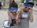 科学館の大観望会、ものすごい人出でした! テレビや新聞の取材も、来てる来てる。各局、各新聞社・・・ 公園入り口にはゲートが組まれ、赤外線を通さないシートをはって、 そこから太陽が見られるようになっていました。 もっと日照があれば、足元の黒いシートにも、太陽が大きく映るらしいのだけど。。 それでも、太陽が少し顔をのぞかせた時に、シートごしにみることができました。 うす曇りだったせいで、目にはよくないけれど、日食めがねなしでも欠けた太陽をみることができて。 (めがねの貸出もたくさんしてくれていたのだけど、むしろめがねを通すと、見えなくて…) あと、ピンホールの投影をたくさん準備してくれていたけれど、 光が足らず、影はできませんでした…残念。 木漏れ日の欠けているようすも、見たかったなあ。 それにしても、平日の今日、なぜここで、家族全員がそろって日食を見ているのか…(笑) 友達と来るはずだったのに。 不思議な気がしました。