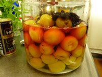 赤じそは不思議なことに、煮ているあいだ、緑色になります。 赤い色素がお湯に溶けだして、抜けてしまうみたいです。 そしてクエン酸を入れた瞬間、ぱあっとルビー色に変わる。 胸がすきっとするような、幸せな気持ちになります。 味は、自分の好きな割合で。。わたしは、少し酸っぱめの方が好きです。 梅干し 7/4 今年は気力的に梅ものはムリかな〜と、梅を横目で見ながら通り過ぎていた先月。 ついに「シーズン終了、最終入荷」の文字がやってきて、思わず購入。 以前作った梅酒はあまり減っていない上、中性脂肪が上がるという義母の話もあり、 梅酒よりは梅干しかなーと、やったことのないフィールドへ踏みこむ決心をしました。(笑) (毎朝見ている「おひさま」で、梅干しだけという戦後すぐの食卓を見て。。の影響もありました) 7/1に漬けはじめ、3日で梅酢がかなり上がってきました。 ここで、冷蔵庫で待機中だった、赤じその登場です。 驚いたのが、赤じその生産、愛知県が全国の3割をしめて一位らしい… しば漬けの京都が本場と思っていたのに。。びっくりです。
