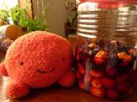梅干し8日目。こんな色になりました。 我が家の梅干しちゃんと一緒に、記念撮影。 しそジュース 7/5 あまりに大袋すぎて、半量をしそジュースにしてしまった昨日。 それが意外においしくできたので、やっぱりもうひと袋買ってきて、作りました。