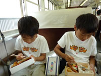 こんなイベントがあると、オットーがラジオで聞いてきたからなんです。 あの杉ちゃん&鉄平が、なんとホンモノの、0系の前で演奏!! 2月に行けなかったコンサート、今度こそ!ということで、行ってまいりました。 坊ちゃんたちも鉄道館に行ける日を心待ちにしていたので、みんなわくわく。 コンサートのためにも、早めにお昼!ということで、駅弁を買いこみ、 食事・休憩場所になっている、電車の中へ。 一昨年行った、大宮の鉄道博物館にも同じ場所があったなあと、 思い出して話しながら、みんなでごはん。