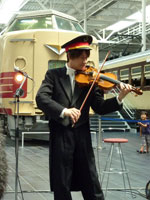 そしてお楽しみの、午後のコンサート風景。 杉ちゃんは0系の前で。 そして鉄平くんは、特急しなのの前です。↓