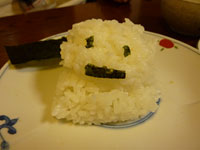 午後にはシャーベット状になって、減りはじめた雪をかき集める。 2階の屋根からも、シャベルとバケツで。(笑) いつのまにか遊びにきた友達と一緒に、はしゃいで作っていました。 暗くなる前に完成した雪だるま2体と、アイスケーキ。 薄暗くなって、写真がちょっとぼけてしまったのが残念。 木の実と落ち葉で彩られたアイスケーキは、とてもきれいでした。 さて、雪だるま完成後に帰宅した小さい坊ちゃん。 生徒会で遅くなり、雪あそびができなくて残念。 晩ごはんの時に、おしゃもじで何かやってると思ったら。。