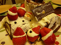 デコレーションは、坊ちゃんたちにまかせて。 子ども会で覚えたいちごサンタを、またまたたくさん作ってくれました。 白いクリームで、雪がつもった薪のつもり。 さあ、お食事タイム!となったときに、なんと、 坊ちゃんたちからサプライズプレゼントが。。