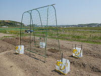 きゅうり・小玉すいか・いんげんのためのアーチ型支柱。 大きいので、2人以上でバランスを見ながら金具で固定し、ネットを張る。 アーチのない部分に、向かい合わせでえびすかぼちゃとまくわうりを定植。