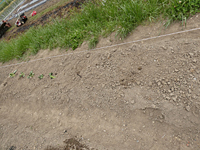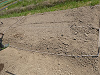 定規でうねのサイズを測ってひもを張り、通路になる部分を掘って、 うねに乗せていく。うねになる部分は、絶対に踏んではだめ。 出てくる石を拾ってバケツに除けていく作業が、意外に大変。 (↑は、次の4のうねの畝たて準備状態)