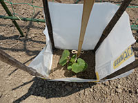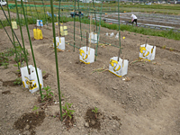 2のうね・3本のきゅうりのうちの2本目(四葉=スーヨー)を植える。 1mの竹の支柱を立て、麻ひもで8の字結び。根づいたなすのあんどんを移動してくる。 1のうね・トマトの伸びた枝を麻ひもで結び、第一回・わき芽かきをする。 これらの作業中に、さつまいもの苗が到着したので、スタッフさんの指導のもと、 さつまいも・里芋植えつけ初挑戦。 (昨年までさつまいもは、共同畑でスタッフさんが植えたものを収穫して、分けていた)