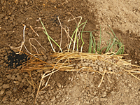 さらに40cmあけて、うねの西側の葉物2種。 ねぎは10cmほど掘って斜面に立てかけ、上からわらをのせ、少しだけ土をかけて押さえる。 (立ち上がってきたら、土寄せ) にらは20cm間隔で穴を掘って水を入れ、、普通に植える。 この反対側(東側)には、モロヘイヤなどの葉物を今後植える予定。 ---------------------------------------------------