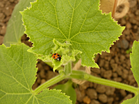 3月末にいったん全部抜いて持ち帰った大量のねぎ、 ゴミ袋のなかで立派なねぎぼうずになって、もう限界!!(匂いも) いよいようねもいくつか立ったし、根っこだけにしてどこかに植えなおそうと、 うちから袋ごと持ちこんで、スタッフさんに聞いてみた。 「えっ!切らないで。これでしょ?」と、スタッフさんがバケツで持ってきたのは、 やっぱり抜かれたままのおねぎたち。(笑) 「こうやるの。きゅうりの虫よけ。」と、見本の畑の中にばらばらと広げられた。 「なるほど〜。」 真似して、鼻をふさぎながら(マスクで)ばらして、うねのあちこちにまき散らしてきた。 ねぎは半年くらいこうやって放置しても、生きているそうです。 しかしナメクジ、どこから入ったやら!ゴミ袋の中で何匹も…。(涙) そして、2のうねのあんどんの中のかぼちゃの葉に、もうウリハムシ!! と身構えたら、テントウムシでした。。