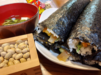 節分 2/2 いつの頃からか…毎年節分には、これを作っている気がします。 そしてまたいつの頃からか…スーパーのちらしに躍る"七福巻"の宣伝文句に感化され、 ちらしの写真をながめては、前年何を巻いたかと、7種類の思案にくれる…。 そして次には、ごはん何合で何本巻けたかと、記憶をたどる…。 料理ノートを出せばいいのに、書いてあるページを探すのが面倒。(笑) 今年は昨年のメモが1年間、メモ立てにはさまったままだったのが幸いでした。 結局、あるもの思いつくものなんでも使って、作るのみ、です。
