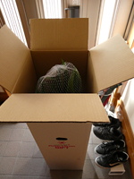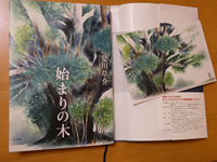 昨年読んだ『始まりの木』の帯に、刊行記念キャンペーンの案内があり、 まだ締切前だったので、応募していたのです。 "オリジナルポストカードつき観葉植物を100名様にプレゼント"となっていて、 表紙のいせさんのイラストのはがきが欲しい!と思ったわたしは、 はがきの大きさから観葉植物もテーブルサイズと勝手に思いこみ、 応募券に読み終えたばかりの熱い感想を書き添えて、送ったのでした。 あの感想が功を奏したのか… とにもかくにも、ここにやってきたこの箱は、それに違いない。 1mを超えるこんな重い箱とは、夢にも思わなかったけれど…。