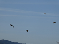 吹きすさぶ風の中、5〜6羽で群れ飛ぶあの鳥は…! 1年前の昨日、わたしの食べかけのパンを奪った、にっくき(?)とんび〜!! パンをまき散らして呼び寄せているおじさんがいて(!)、 わたしのパンがなぜ狙われたか、納得しました。(笑)