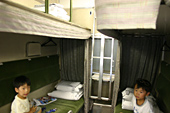 あかつき号は、佐賀県の鳥栖まで、熊本行特急「なは」と併結しています。 寝台特急は、オット以外、皆初めて。 空いていたのが幸いでした。 京都を出て、新大阪、大阪、と、在来線の線路をひた走ります…。 ------------------------------------------------------------------------------ 寝台特急、乗ってまず驚いたのが、クーラーの寒いこと! これは毛布なしでは、間違いなくカゼっぴき…とあせる。 入念に坊たちに布団をきせて寝かせて… 普通の座席の1.5倍くらいの幅のベッドに、 小さい坊と寝ているわたしは、はみだしてつらすぎる〜。 ・・・・・ それでもうとうとして深夜、今度は暑くて目が覚めた。 カーテンを開けて、先ほどまでがんがんにきいていたクーラーが ほとんどきいていないことを確認。 もう、あまりに極端で、笑いがこみあげてまいりました。。。 この行きの電車のなかで、 いろいろな過去のできごとを思い出していました。 もう記憶の彼方、完全に忘れ去っていたことが唐突によみがえり、 その記憶の中のモノの、質感までリアルに思い出したり… ふだんはすっかり忘れている、 二十代のあるひとときをともに過ごしたひとたちの、 その頃のつながりやなんかを思い出したり… 今はどうしているのか分からないひとたち。 みんな今も、夢を追って生きているかしら。 ------------------------------------------------------------------------------ (2006.9.1) |