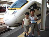 と、大喜びで窓外に広がる景色にカメラを向けていたわたし。 ・・・を、突如襲った悲劇。 それは・・・バッテリー切れでした。 このところ、写真をほとんど撮っていなかったことが仇に。 電車に乗ってから、「あれ?バッテリー、大丈夫だったかな?」と気になる。 さらに充電器のことなど、全く頭になかったのです。 恐れていたとおりのことが…絶体絶命。 ------------------------------------------------------------------------------ ![]() 窓外の有明海も撮れないまま、8時54分、 心臓ばくばくで長崎駅に到着〜! な、なんのために、ここまで来たの…。(涙) とりあえず、コンパクトカメラでしのぐ。 夜中にしっかり寝て、朝は列車探検をした小さい坊ちゃん、 夜中寝られなくて、6時ごろから熟睡して、起こされたばかりの大きい坊ちゃん、 特急「かもめ」の前で記念撮影。 ------------------------------------------------------------------------------ まずは駅の観光案内所でホテルの予約を入れ、 お店の開店時間に合わせて、大きな電器やさんへ。 カメラのバッテリーに望みをつないで… ああ神さま、と祈る思いでした。 +++++ しかしそのお店では、同じバッテリーは扱っていないとのこと。 当然、充電器も置いていませんでした。 一度は「あきらめよう…」と言ったオットでしたが、 突如、「カメラのキ○ムラや!それしかない!」と叫び、 電話帳をめくりはじめたのです。。 +++++ 中心部からは少し離れたところ、 路面電車の終点の少し先、 JRの駅ではみっつ上ったあたりに、その店はありました。 電話帳の地図でそれを見つけ、電話をかけて、 同じバッテリーがあることを確認、購入を前提に充電しておいてもらうことに。 神さまが助けてくれた…とホントに思いました。 絶望の淵から救われた気分。 とりあえず、フル充電されるまでには時間がかかるため、 ホテルに荷物を預けたあと、しばらく観光することに。 この間、コンパクトカメラ大活躍。