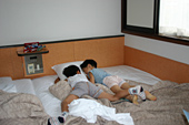 さて、ここでなんと、まさしさんのお父様にお会いしました。 二十年ほどのあいだに何度となく、コンサートでお見かけはしていたものの、 最近はどうされているのかなーと気になっていたところ。 オット、ひれ伏し、起こされる。(笑) 坊たちはささだんごとチョロQをもらって、ご満悦。 奥様ともどもお元気でいらっしゃるそうで、何よりでした。 「あと4つで90だからね〜」とおっしゃりつつ、いろんな話を聞かせてくださいました。 「奥さん、偉いよー、男の子ふたりも生んで、育てて。 いいよ、男の子の兄弟は、大きくなっても助けあっていくからね。」 そう言われて、ものすごく救われた気がした。 佐田家の息子さんたちみたいに、助けあっていってくれたらいいなあとも、思った。 とにかく、すごくすごく、うれしかったです。 +++++ お店のおばさんも坊たちを可愛がってくれて、 オットはものすごくうれしかったらしく、「明日、また来ます」と約束していました。 明日はひそかに、熊本のウルトラマンワールドに行く野望があったらしいのですが、 打ち砕かれたようです。(笑) 二日間、長崎満喫〜の予定になりました。 ------------------------------------------------------------------------------ さて。 お店を出て、思案橋から市電に乗り、 くだんのカメラバッテリーを買いにいくことに。 距離があることから、 1、おとな単身でタクシーで行く。 2、タクシーなら同じことだから、全員で行く。 3、市電の終点までは一日乗車券を駆使し、あとタクシー。 4、電車の時間が分からないけど、JRで行って、あとタクシー。 など、いろんなパターンを思案したのですが(思案橋だけに)、 とりあえずタクシーに乗りやすい長崎駅前まで市電で行くことにしました。 +++++ ところがここで、予期せぬ?事態が。 さっきまで大はしゃぎだった小さい坊ちゃん、いきなり、寝る!(笑) これがまた、ほんとに、いきなり。 「あっ。まま、いじゅがねた!」と大きい坊が叫んだ瞬間、ぐうぐう言ってました。 おかげで、「タクシーあるかどうか分からんけど、このまま終点までいこ〜」ということに。 これが本当に上手くいきまして、 小さい坊ちゃんはしっかりお昼寝、 わたしたちは、16年前のコンサート会場の前を通ることができ、 大きい坊ちゃんは窓から路面電車をめいっぱい楽しみ、 おまけにタクシーにもすぐ乗れて、お代もほとんどかからずにすみました。 カメラバッテリーは、ばっちり新品・充電。 旅の途中で切れることはないでしょう。 旅の神さまに深く深く、感謝です。 そして、カメラのキ○ムラさま。 もう、足を向けて寝られません…本当にありがとう…。(涙、涙) +++++ そうして夕方4時すぎ、無事にホテルにチェックイン。 すでに荷物を預けてあったので、すんなりお部屋に案内してもらえました。 「ファミリールーム」のあるホテルということで紹介されたのですが、 トリプルベッドにソファ、テーブルなどがある広々としたお部屋。 これで、お願いした予算の半額くらい。(笑) え?ウソやろ?それ、ひとり分の料金では?と首をひねりましたが、 間違いではなかったようです。。 ![]() 坊たち、笑って「うそねり」(ウソ寝)の図。 ------------------------------------------------------------------------------ さあ、日が落ちるまでに、あともうひと観光! ただいま「長崎さるく博 '06」が開催されている長崎では、 あちこちでイベントが行われているようす。 ホテルのかたにていねいに説明をしてもらい、 グラバー園が期間限定のライトアップ中ということで、そこを目指すことに。 まずはハラごしらえ〜ということで、 ホテルを出てすぐの中華街に入り、江山楼本店に参ります。 ここの2Fで、『解夏』の食事シーンが撮影されたんですよ〜。(しつこい) わたしたちは、1Fのテーブル席で。 ![]() 特製チャンポン、特製皿うどん、春巻、堪能。