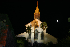坂を下り、見上げた大浦天主堂。 上弦の月の翌日、煌々と月が輝いていました。 秋を実感した瞬間。