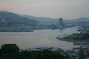 石橋からは、斜行エレベーター「グラバースカイロード」で、 一気にグラバー園のてっぺんまでのぼります。 エレベーターなんだけど、斜めに進むので、坊ちゃんたち、びっくり! +++++ エレベーターを乗り継ぎ、ふたつめを降りて、そこに広がった夕景。 長崎港の向こうに、稲佐山。